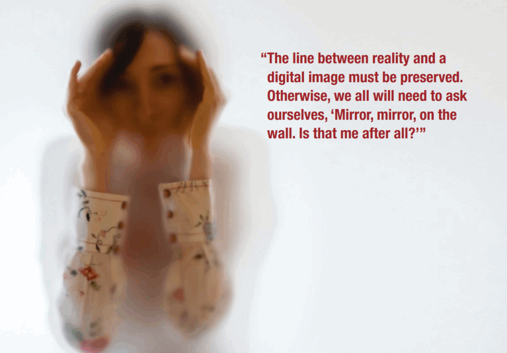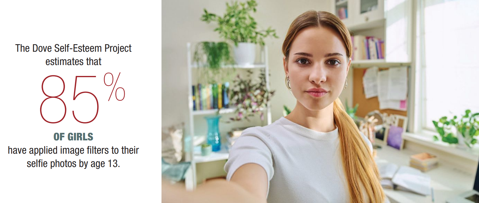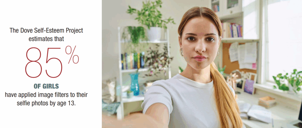 The Dove Self-Esteem Project estimates that 85% of girls have applied image filters to their selfie photos by age 13. This is concerning because it creates a desire to appear to others as we want to be seen, not as we truly appear in the mirror. It is also worth mentioning that the face in the mirror appears different due to distortion induced by the camera lens, especially wide-angle lenses that alter the face by making everything appear broader.